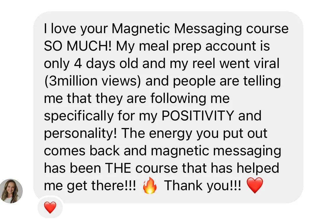 I just hit 4 figures in one day because of Magnetic Messaging. This course changed everything, my reels started getting 5 and 6 figure views. I launched coaching hit 5 figure months. My husband said you are his favorite person he never met.